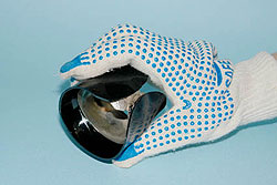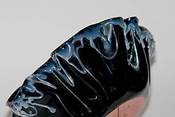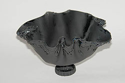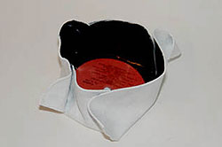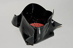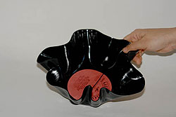 3. Надев перчатки, достаньте пластинку и сформируйте из нее вазу с драпированными краями. Чтобы форма вазы получилась относительно симметричной, можно положить разогретую пластинку в миску, распределив ее складками по внутренней поверхности посуды. Подождите примерно пару минут, и форма затвердеет. Если с первого раза ваза не удалась, не огорчайтесь, положите пластинку обратно в духовку, винил распрямится, и можно начинать лепить снова.