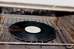 2. Нагрейте духовку до температуры 120-140 градусов и положите в нее пластинку. Будьте внимательны, винил очень быстро становится мягким. Нужно не пропустить момент, когда он будет податливым, как пластилин, и еще не расплавился.
