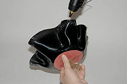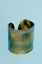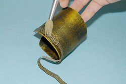 26. Промажьте клеем ПВА края браслета и аккуратно приклейте орнамент, разглаживая его кистью, смоченной клеем. Особенно осторожно приклеивайте рисунок на закругленные части браслета. Если тонкая бумага порвалась, отрежьте маленький кусочек с аналогичным рисунком и приклейте поверх разрыва - ваша оплошность станет незаметной.