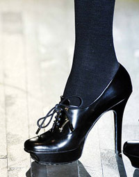 ▪ Туфли и ботильоны имеют темный оттенок и высокий каблук, сделаны из кожи или твида, носятся с плотными колготками. Острая шпилька слегка уступила свои позиции устойчивому каблуку, сужающемуся к основанию, но авторитета не потеряла. В моде классические лодочки, с ремешком, подчеркивающим тонкость лодыжки. Массивный каблук может сочетаться с платформой. Цвета – от чёрного до вишнёвого и винного, с металлическим блеском или выдержанные в аскетических серых тонах. Особое внимание стоит уделить чёрным лаковым ботильонам на платформе – это, несомненно, хит сезона.